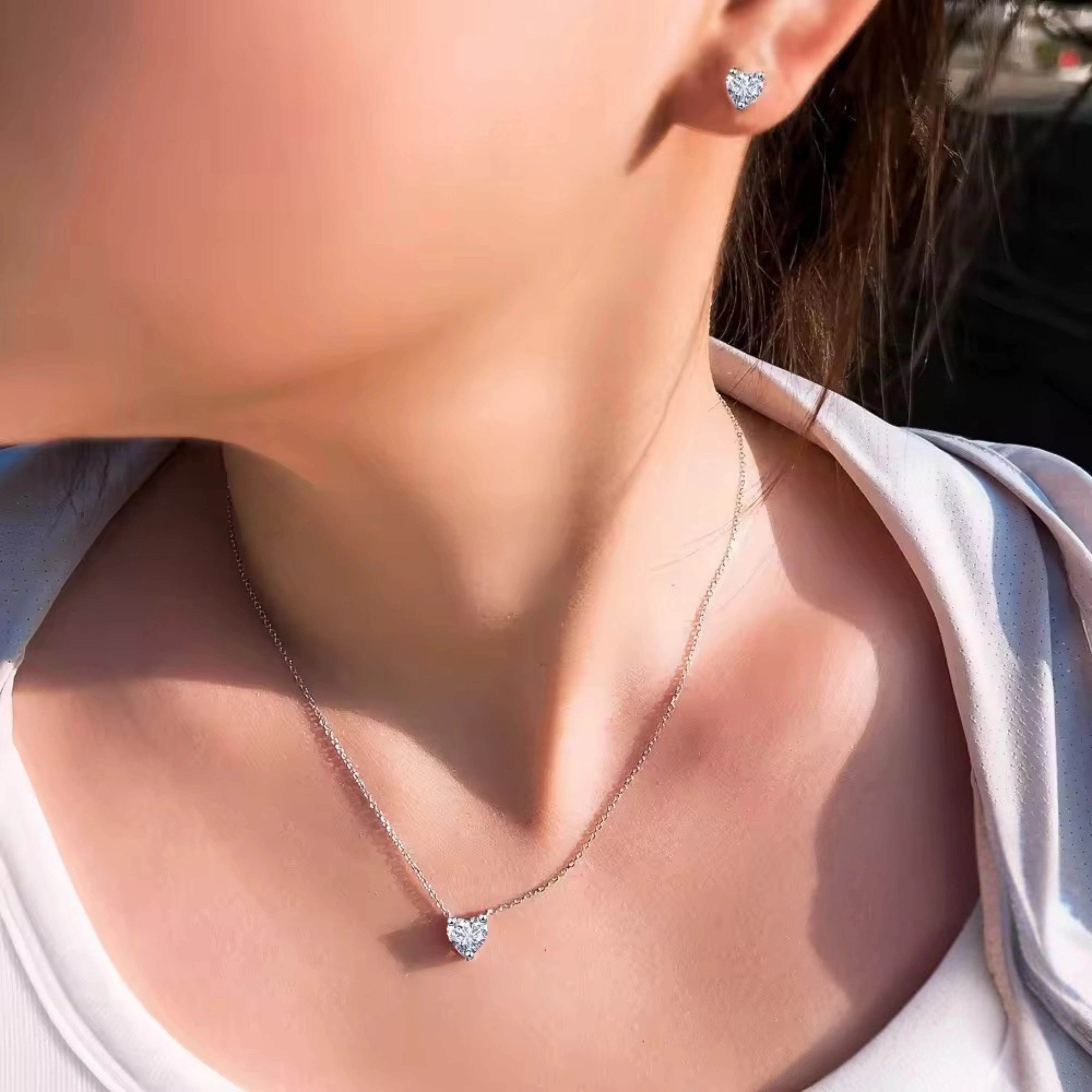 Minimalist 925 Sterling Silver Shiny Heart Cut Cubic Zircon Necklace and Earring Jewelry Set