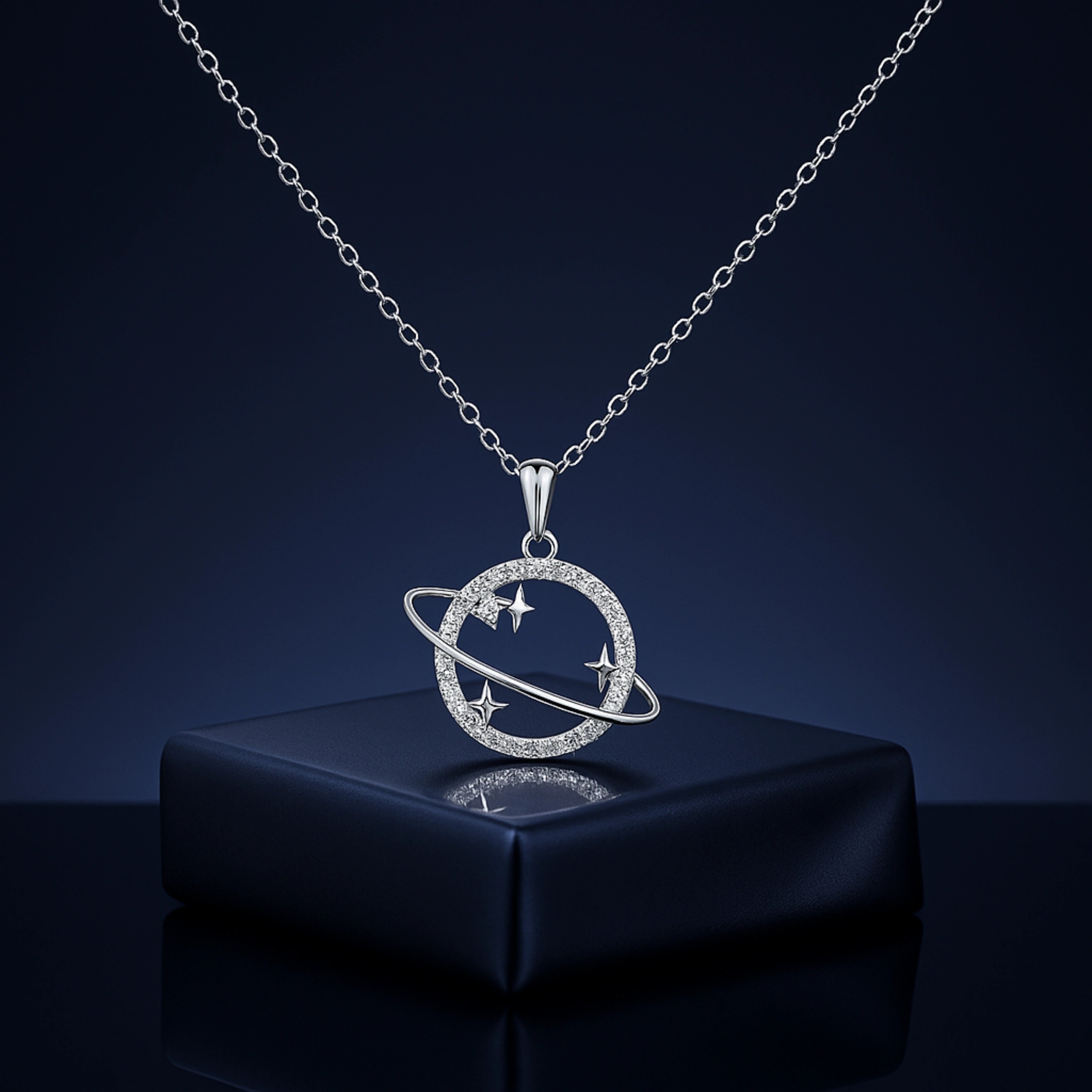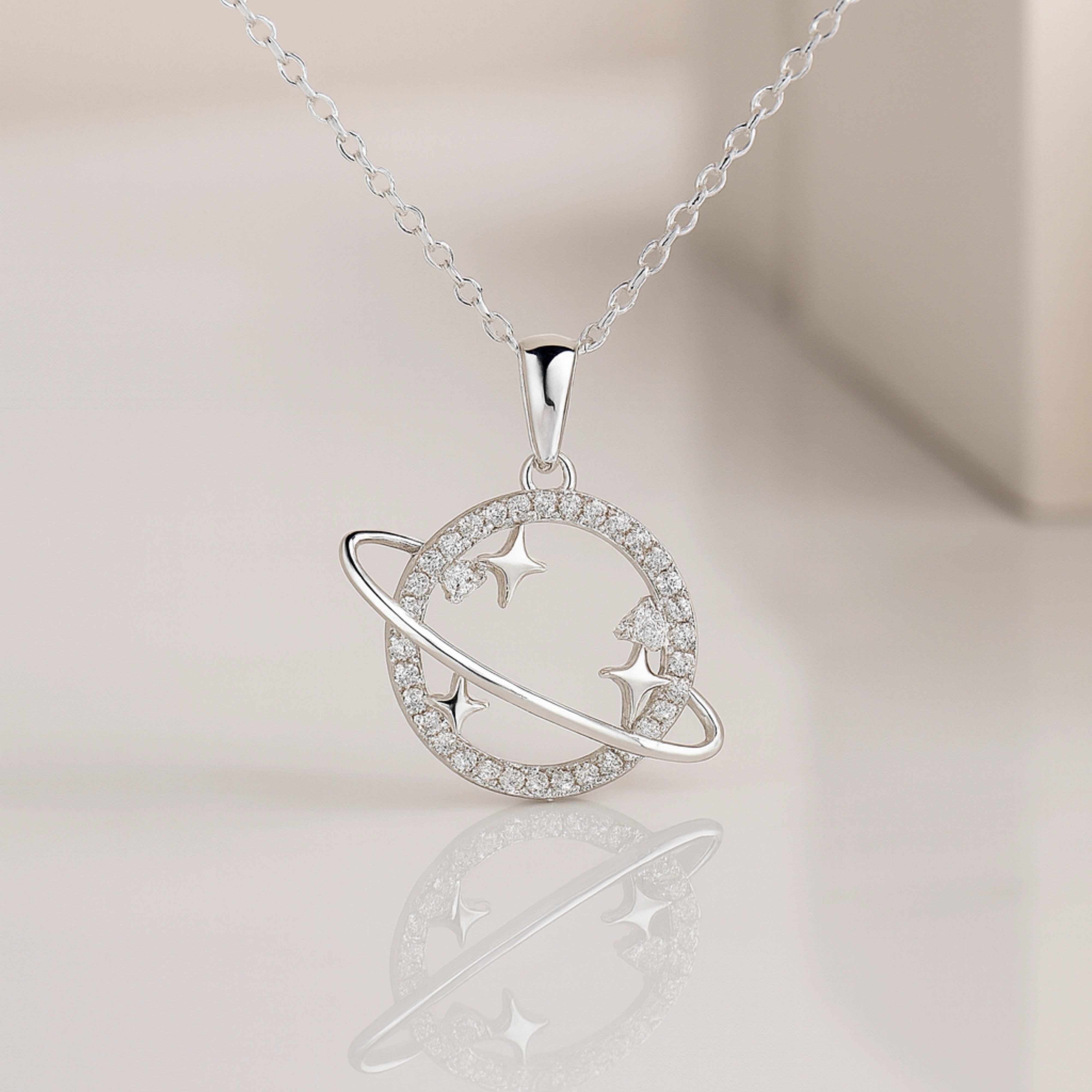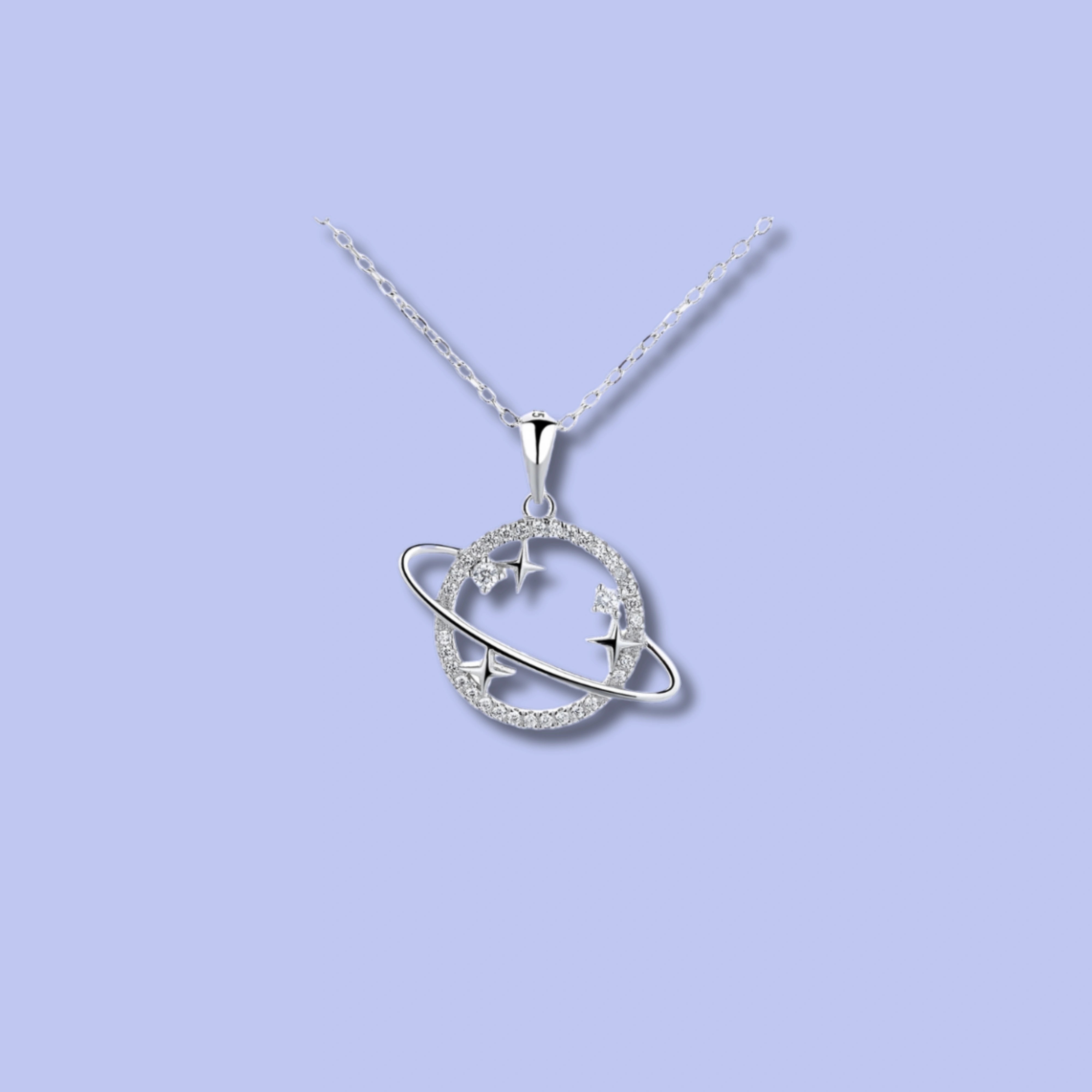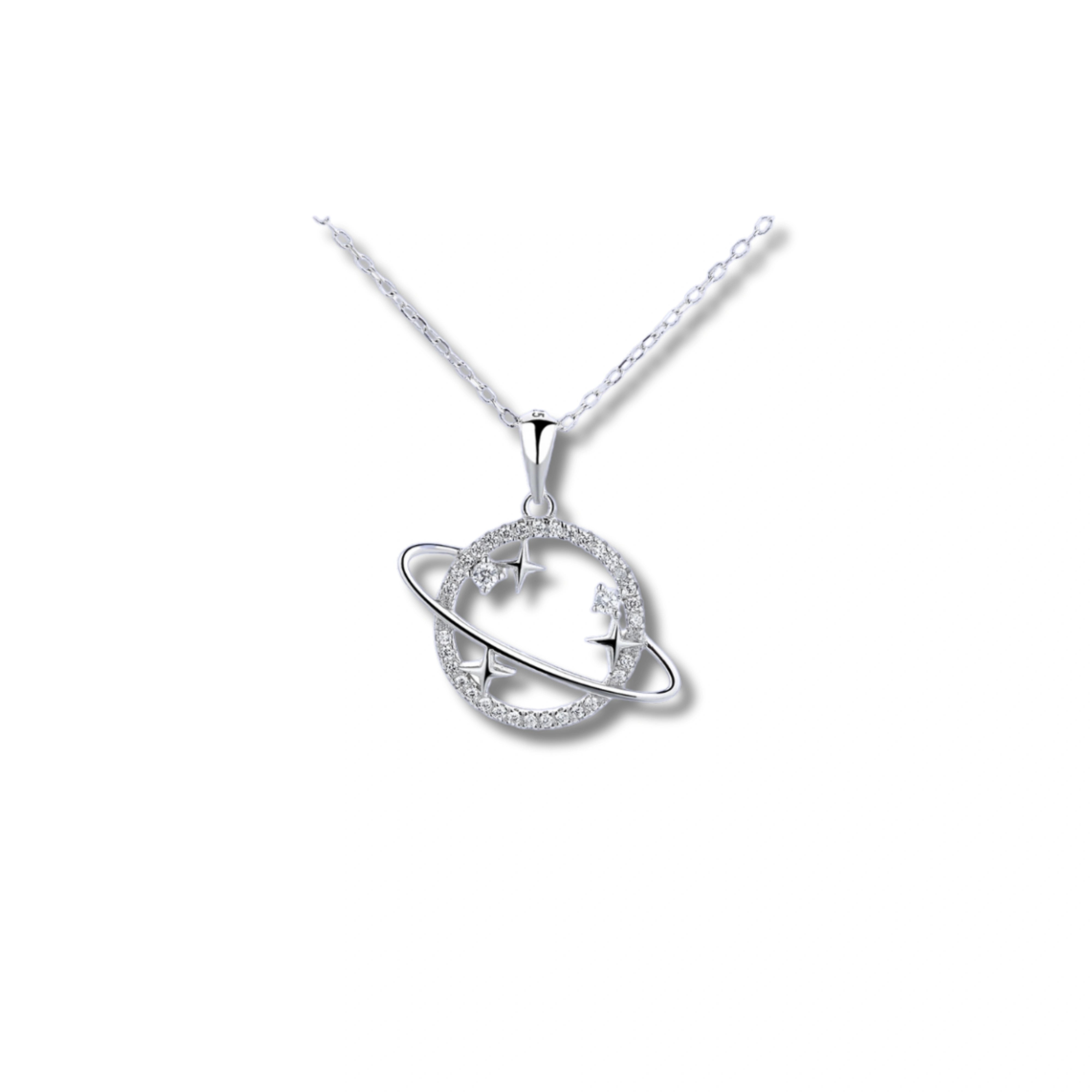 925 Silver Planet and Stars Pendant with Crystal Circle