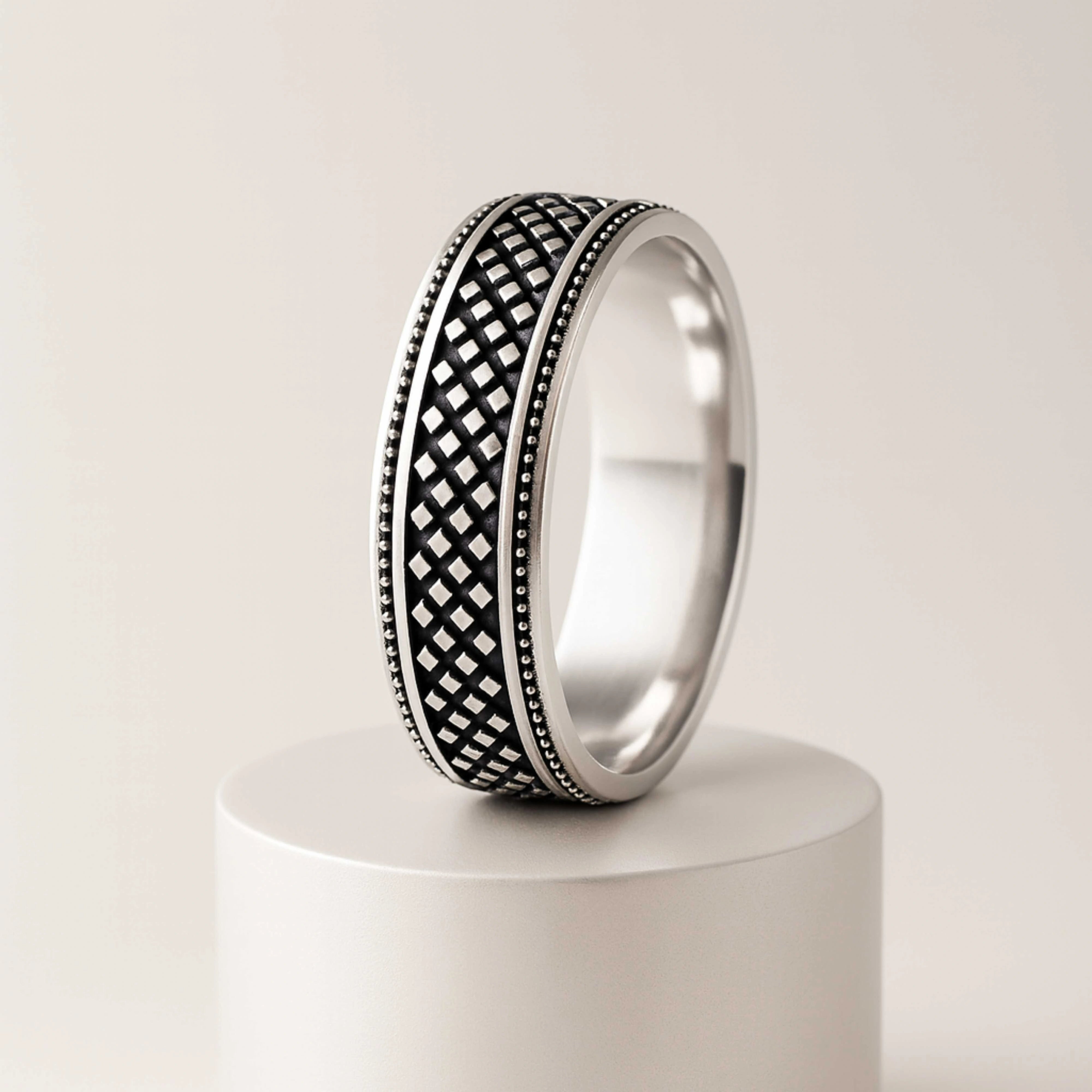 925 Sterling Silver Men’s Ring | Rhodium Plated Lattice Pattern Band