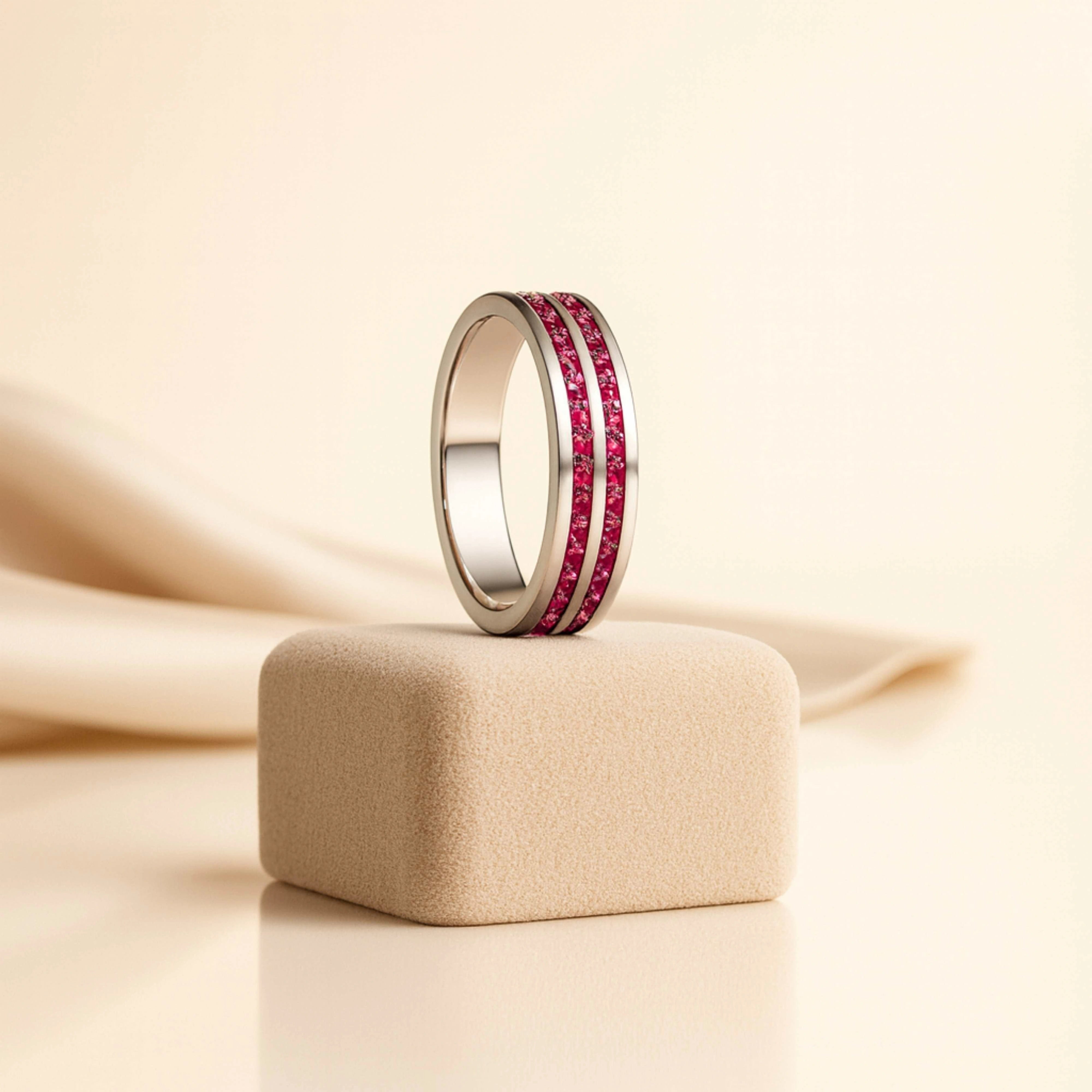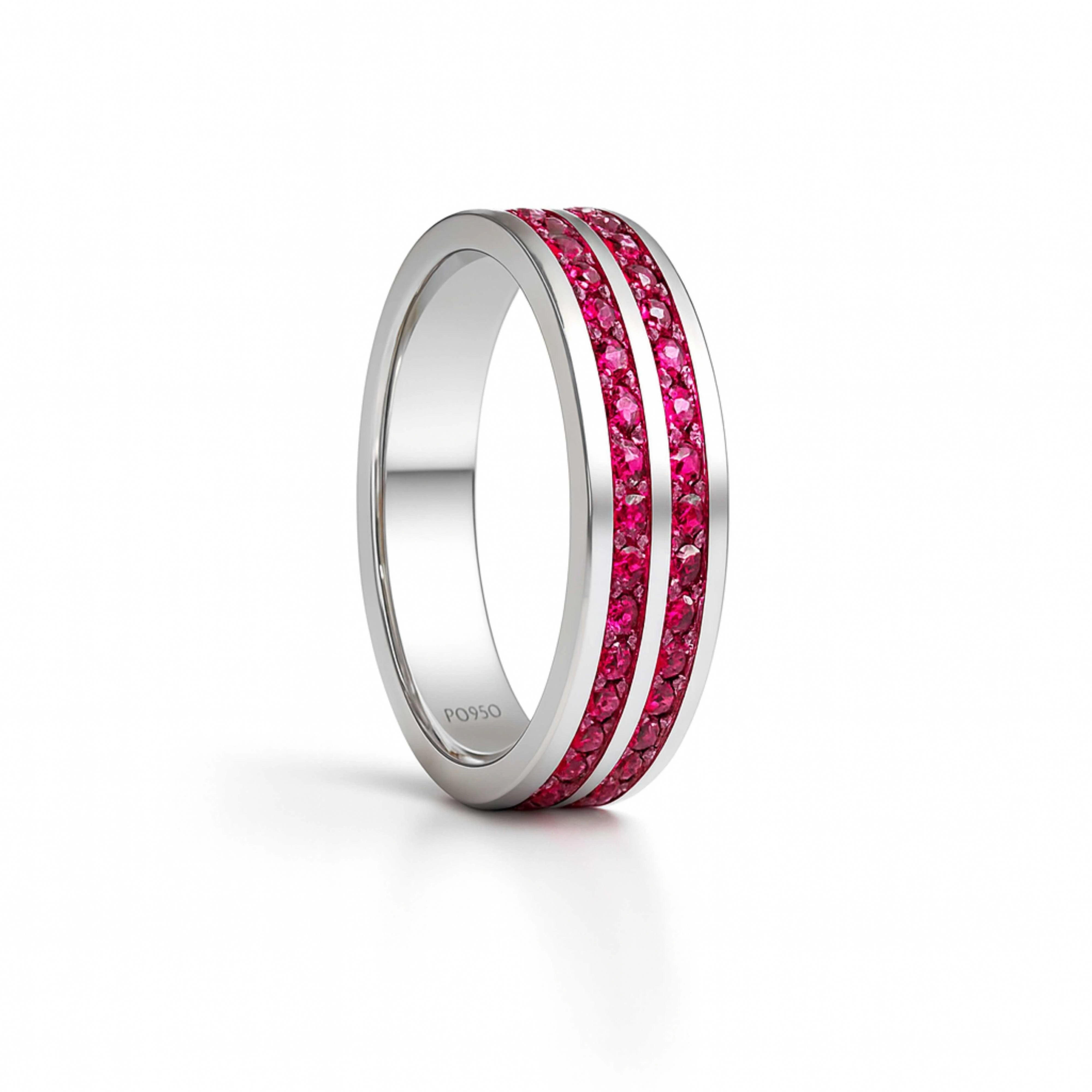 925 Sterling Silver Men’s Ring with Double Row Red Stones | Rhodium Plated Channel Band