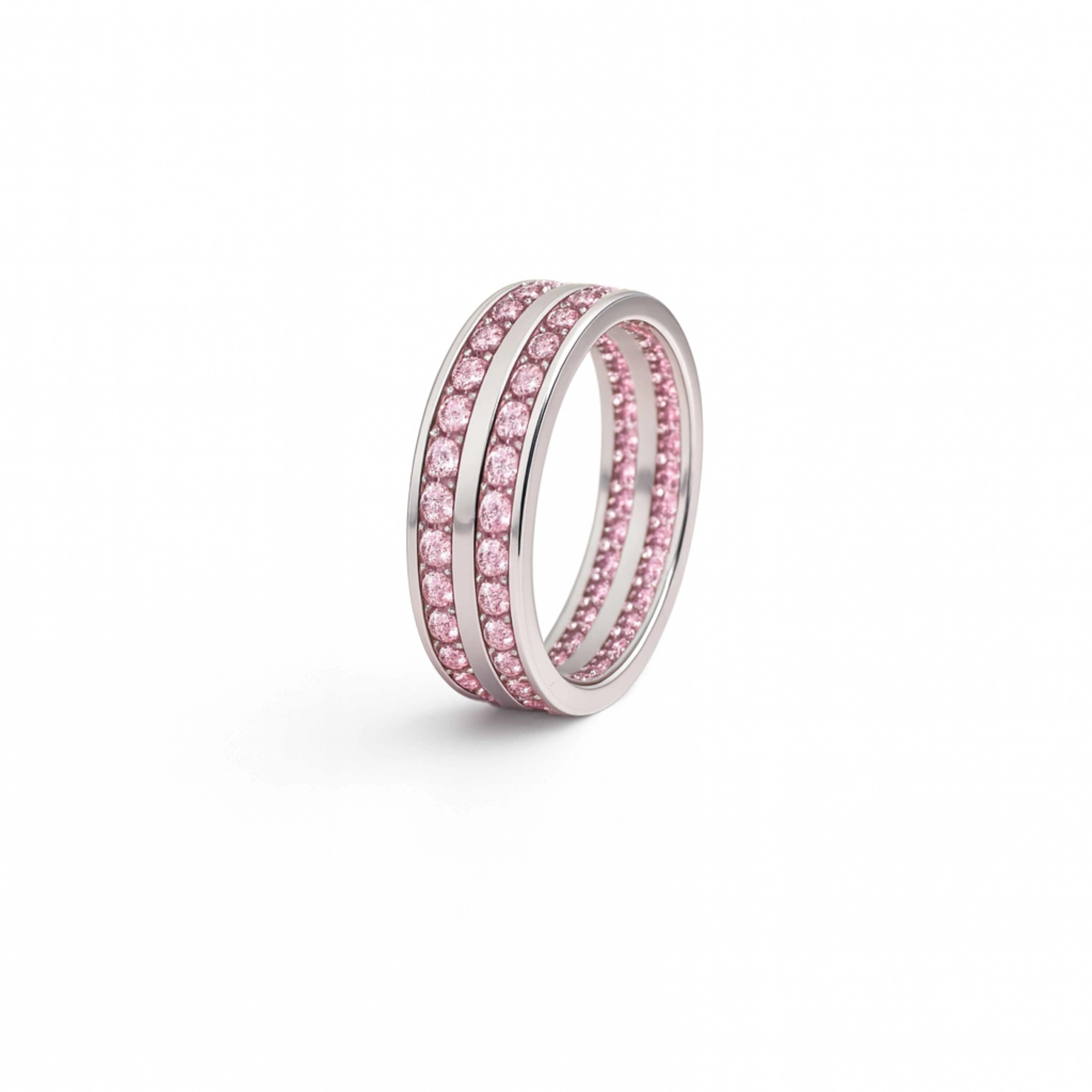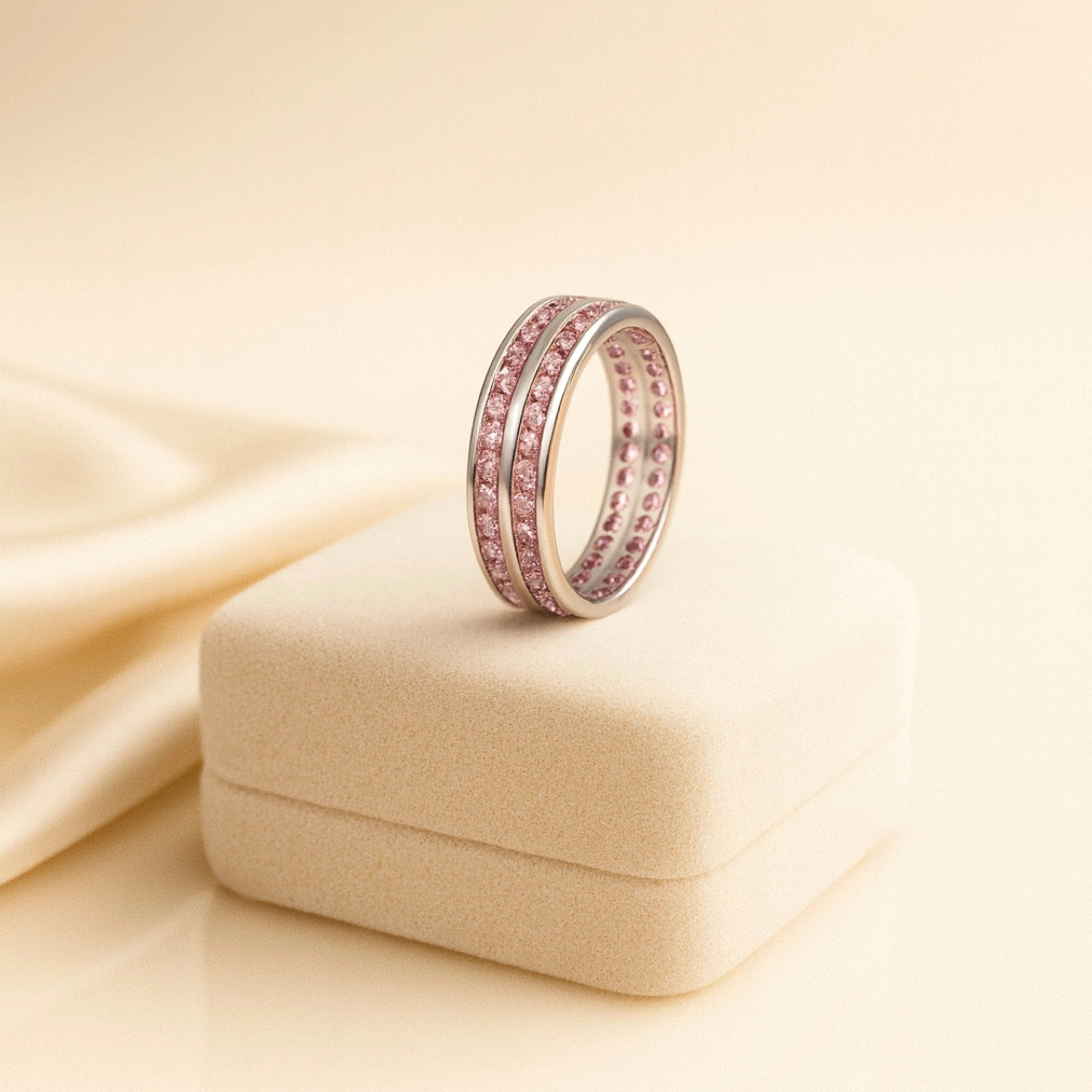925 Sterling Silver Men’s Ring with Pink Sapphire Stones | Double Row Band, Rhodium Plated