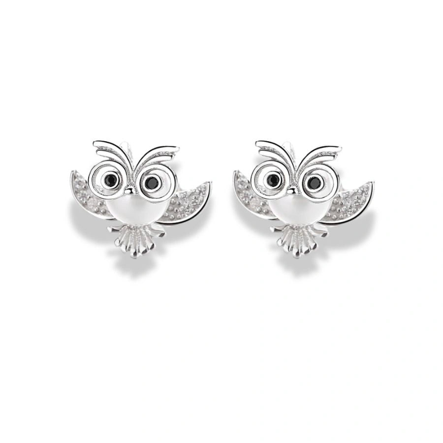 925 Sterling Silver Owl Stud Earrings – Rhodium Plated with Cubic Zirconia