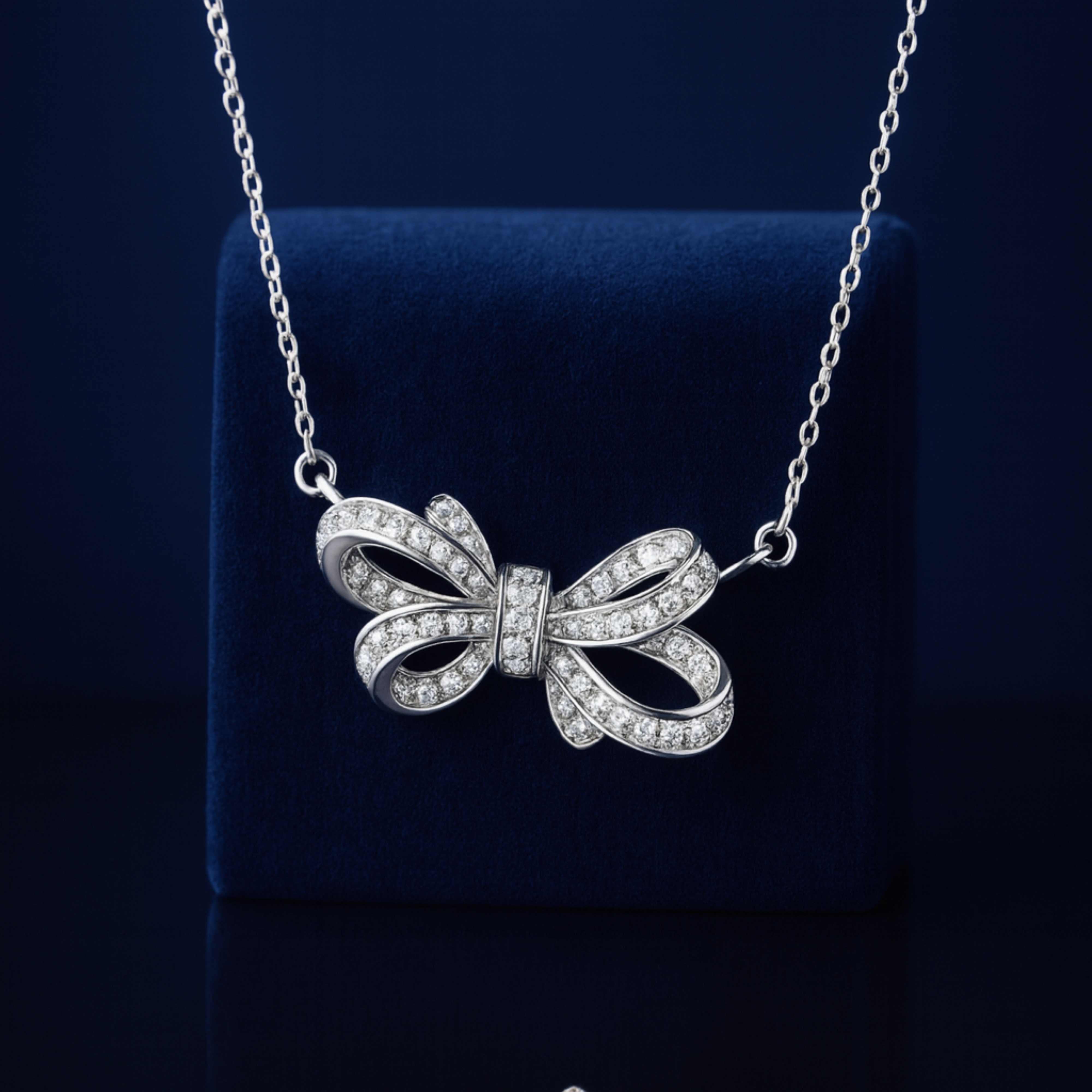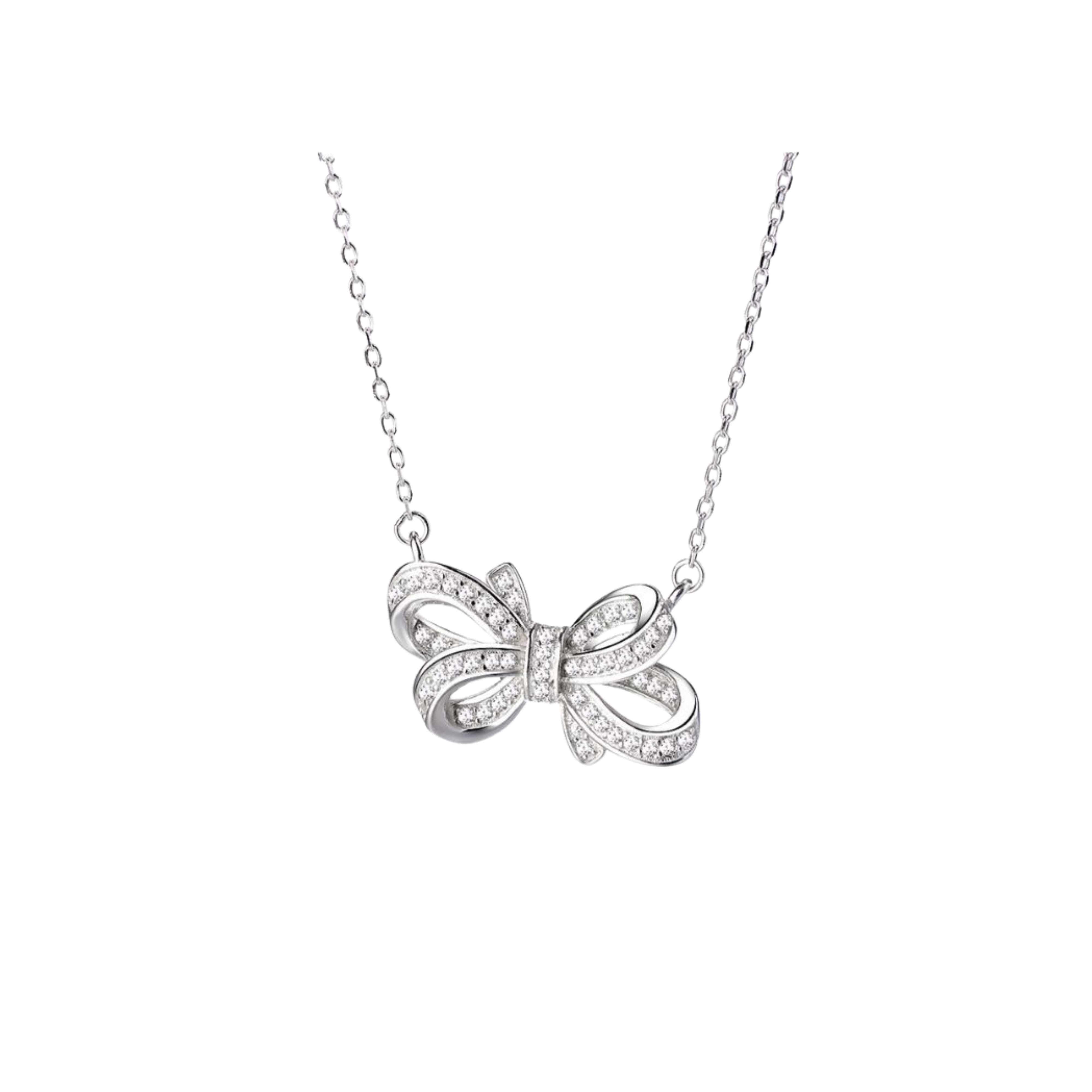 925 Sterling Silver Rhodium Plated Bow Necklace with Cubic Zirconia