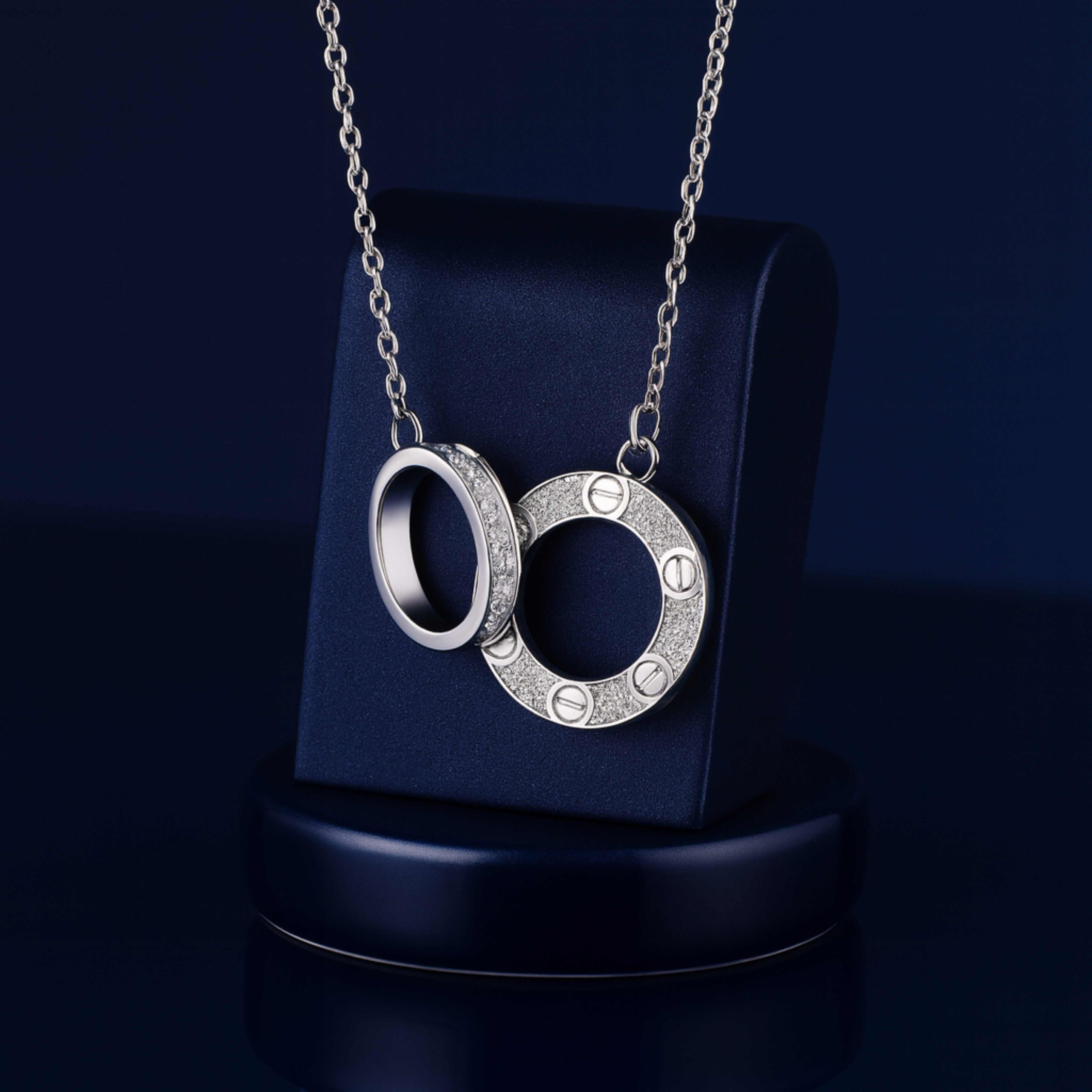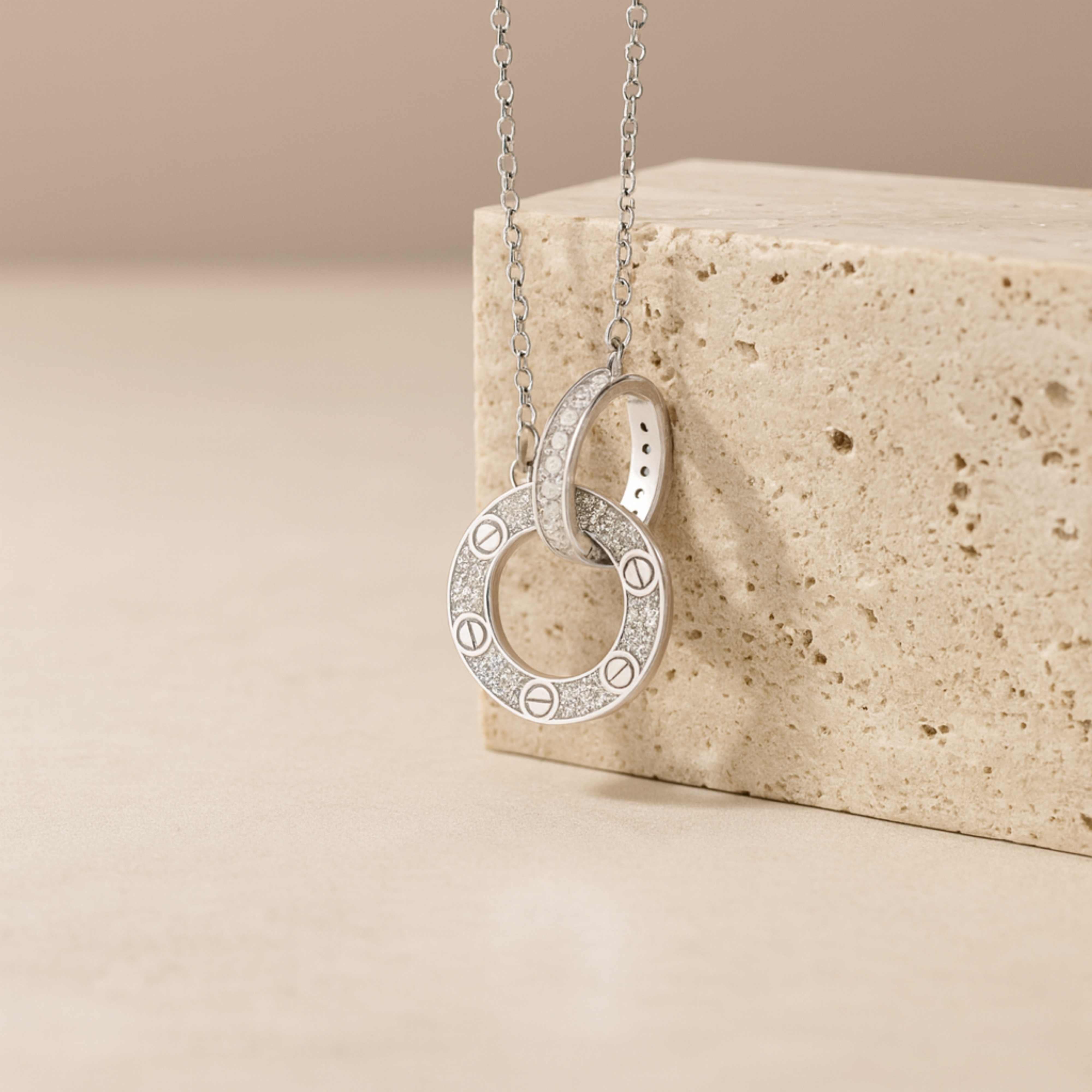 925 Sterling Silver Rhodium Plated Double Ring Pendant Necklace with Cubic Zirconia