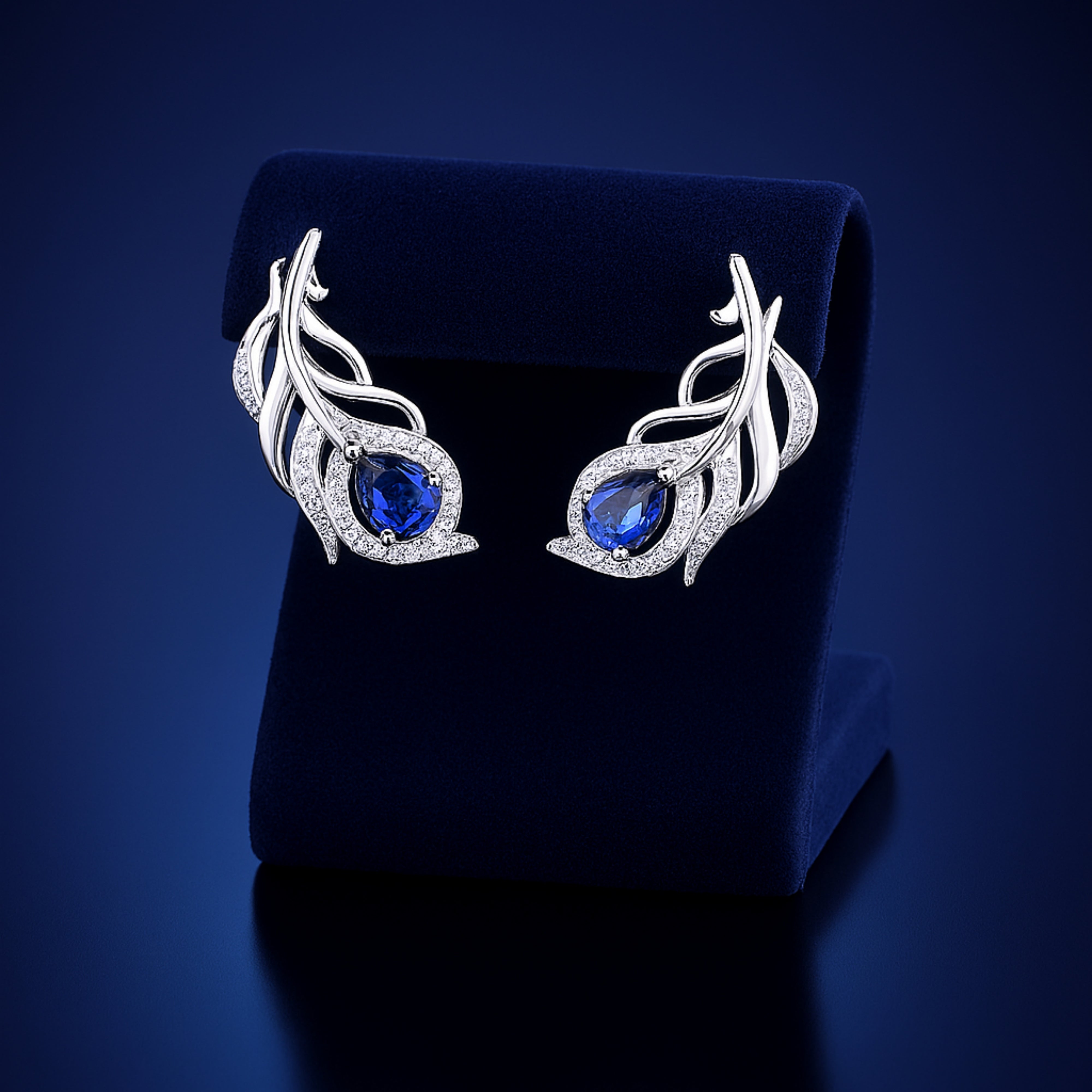 925 Sterling Silver Rhodium Plated Peacock Feather Ear Cuffs with Blue Cubic Zirconia