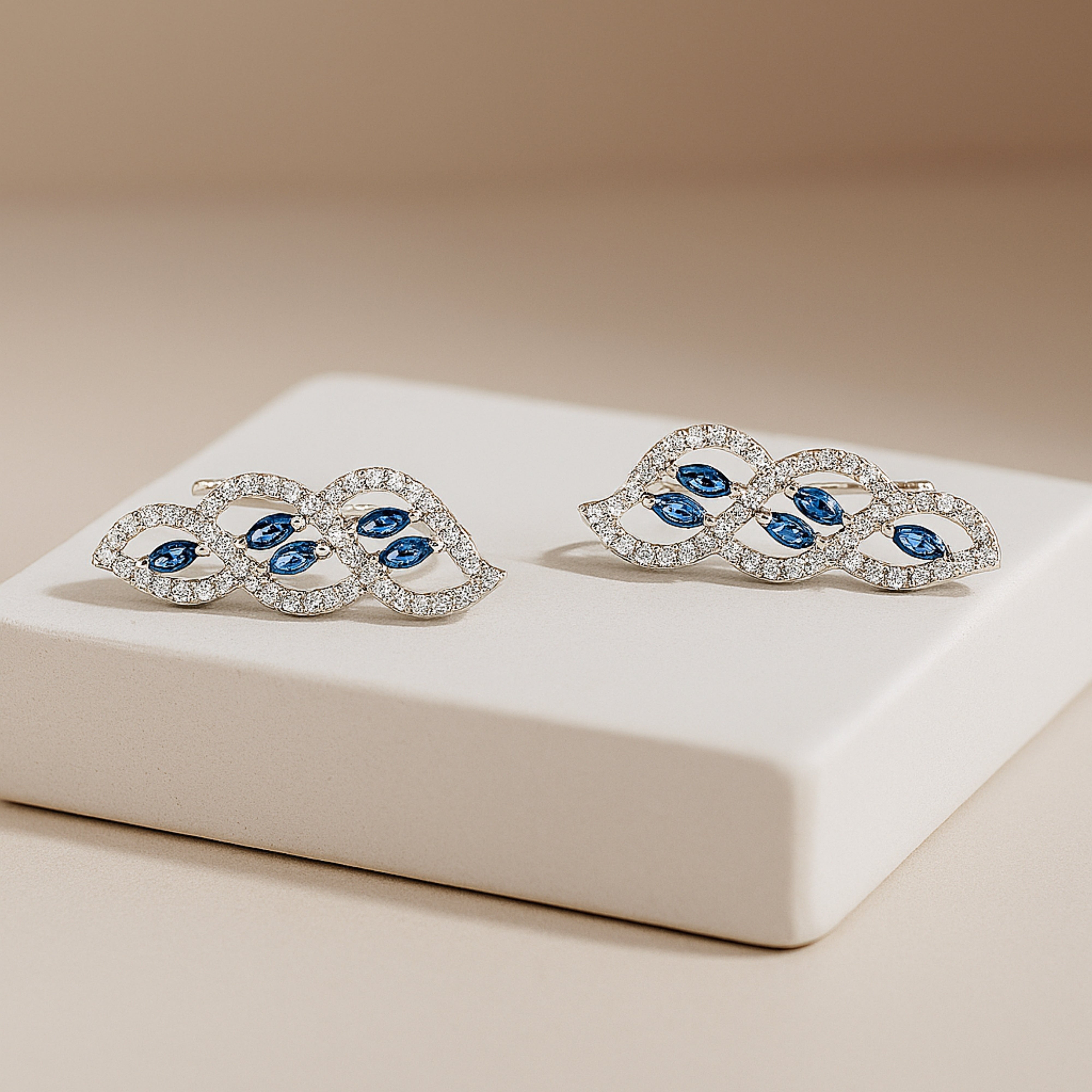 925 Sterling Silver Rhodium Plated Twisted Leaf Ear Cuffs with Blue Cubic Zirconia