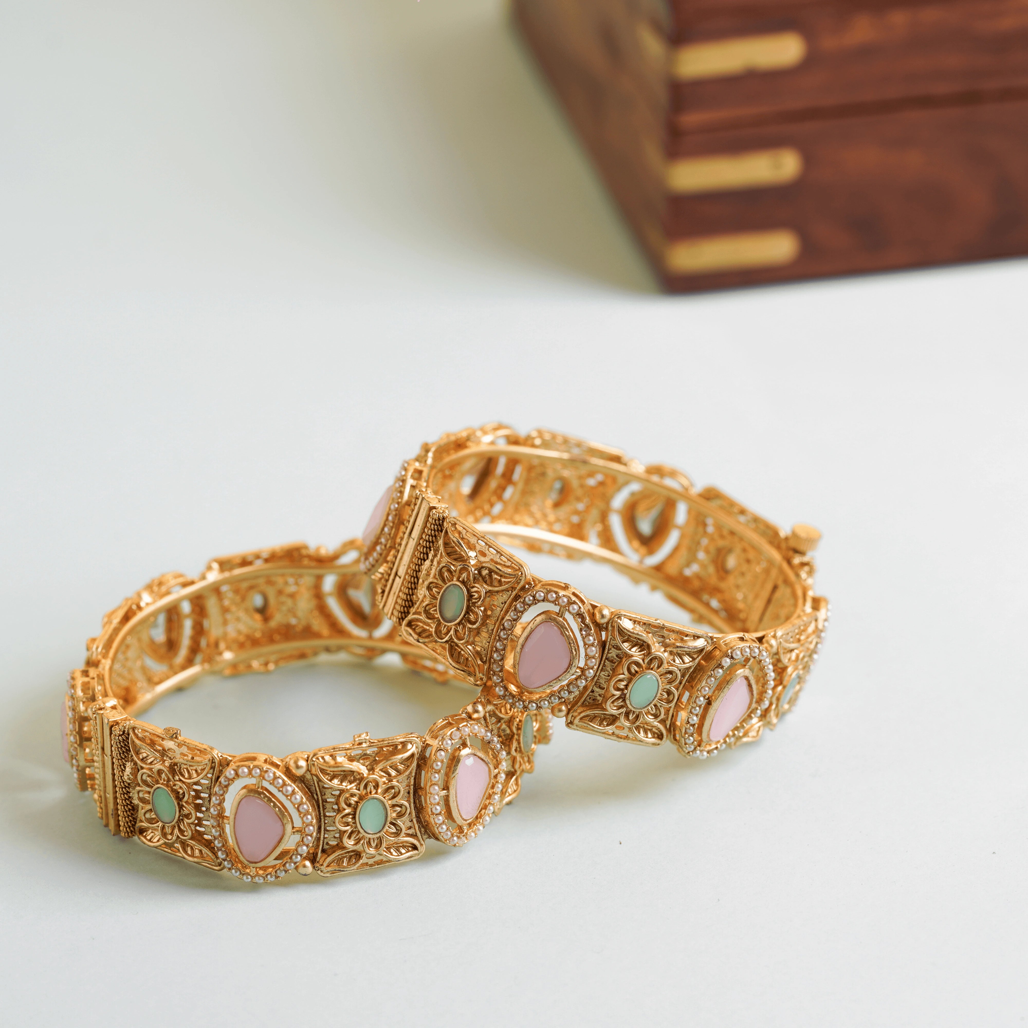 Fancy Gold Plated Temple Design Gulabi Diamond Rajwadi Bangles