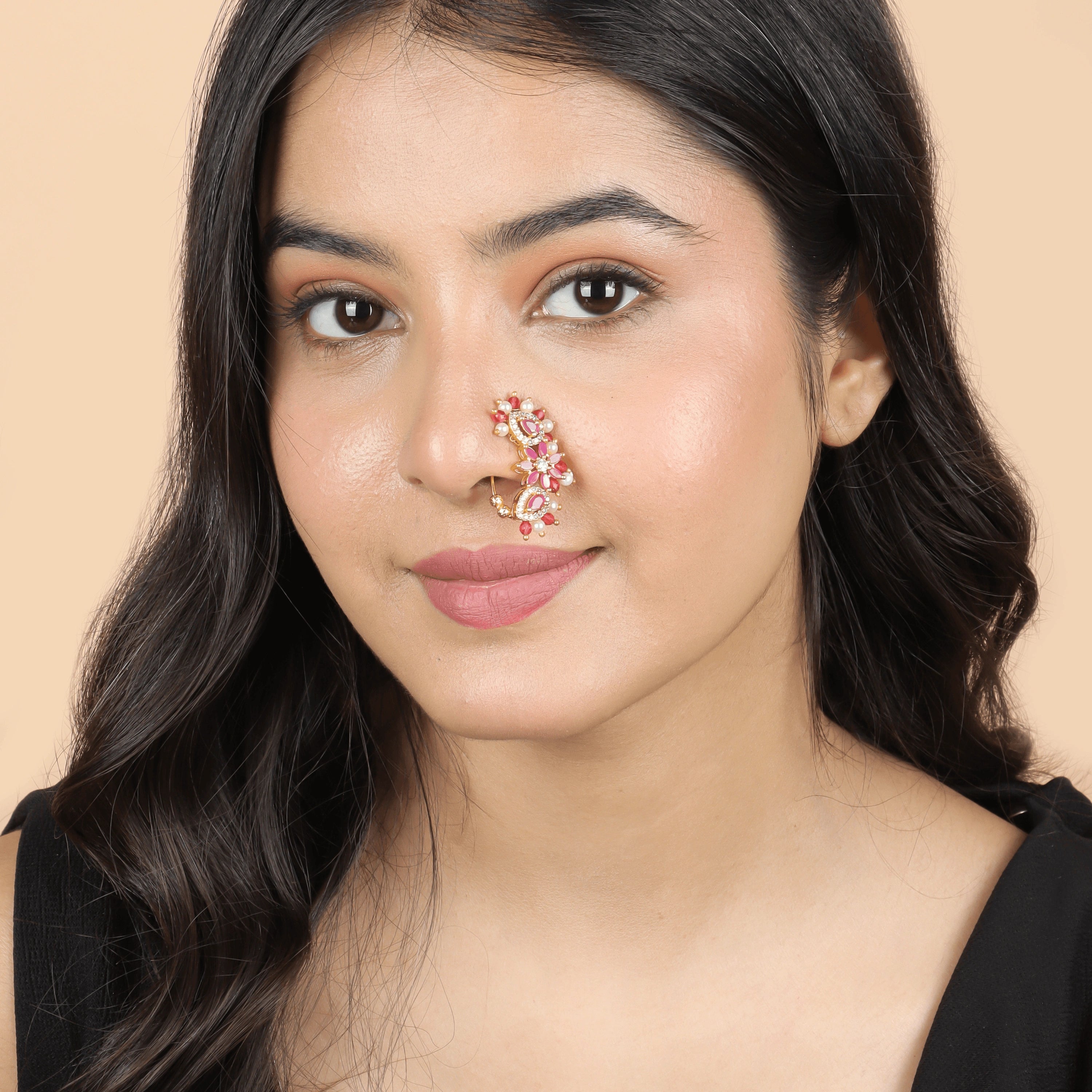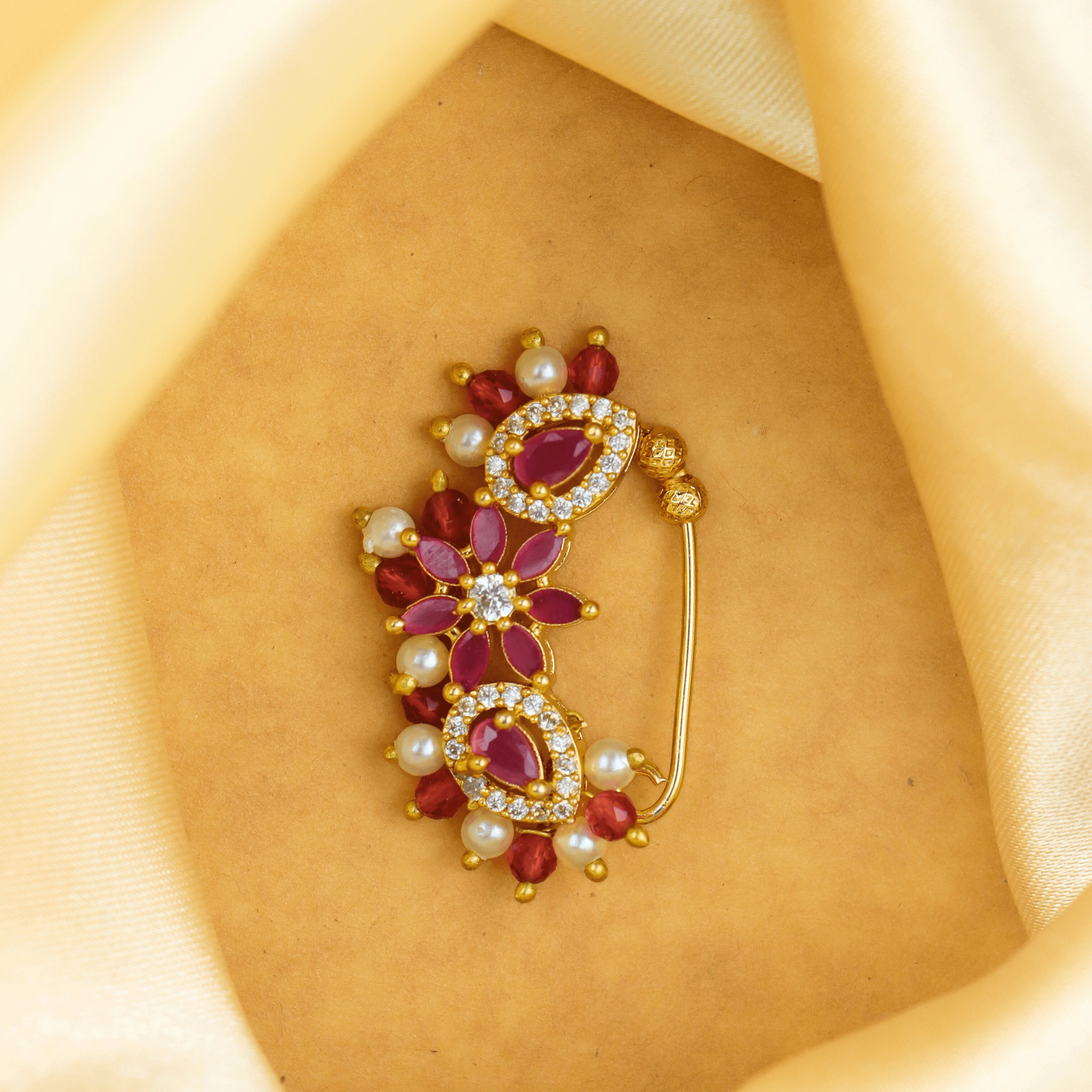 Majestic Red Stone Beautiful Design Gold Plated Maharashtrian Nath - Rukhmani