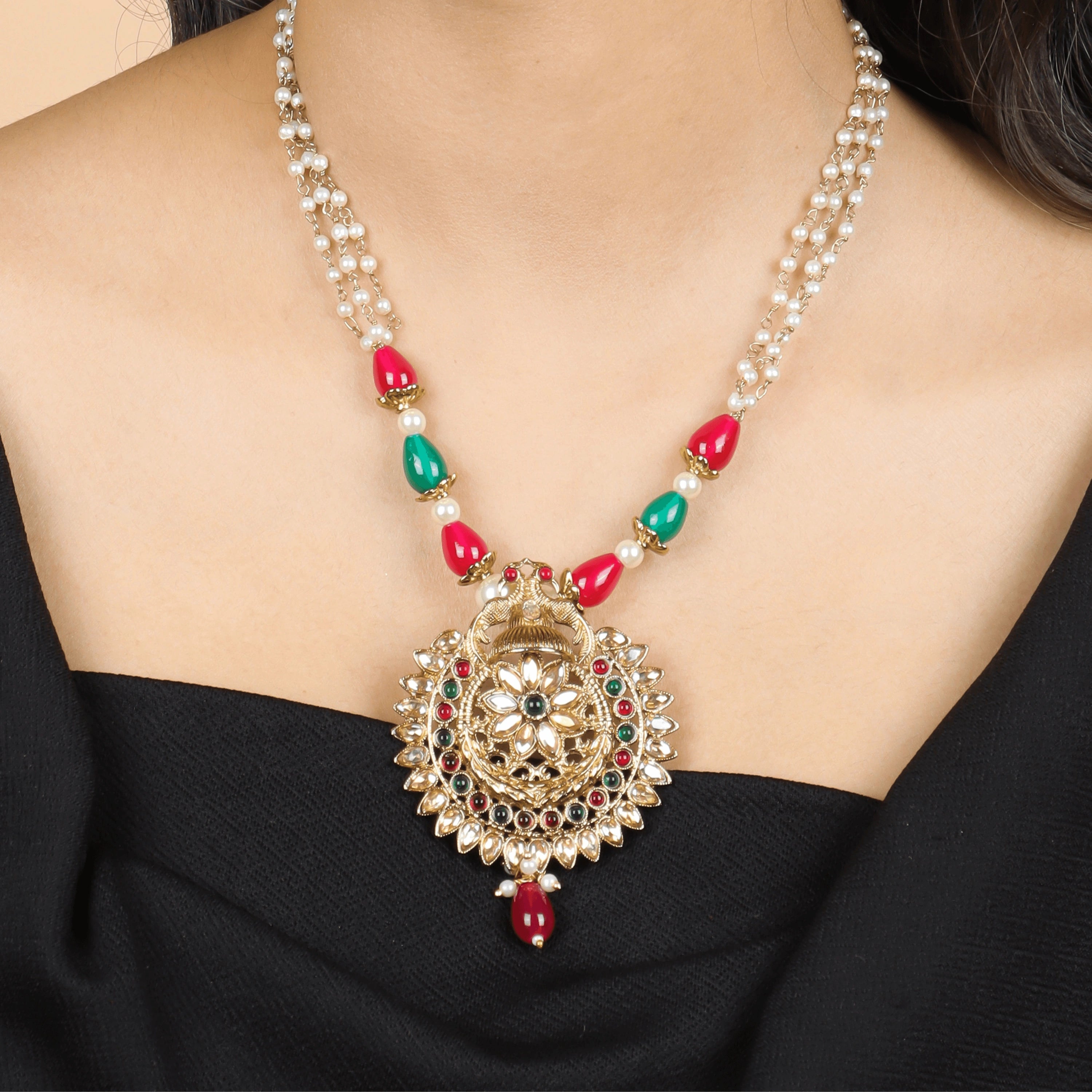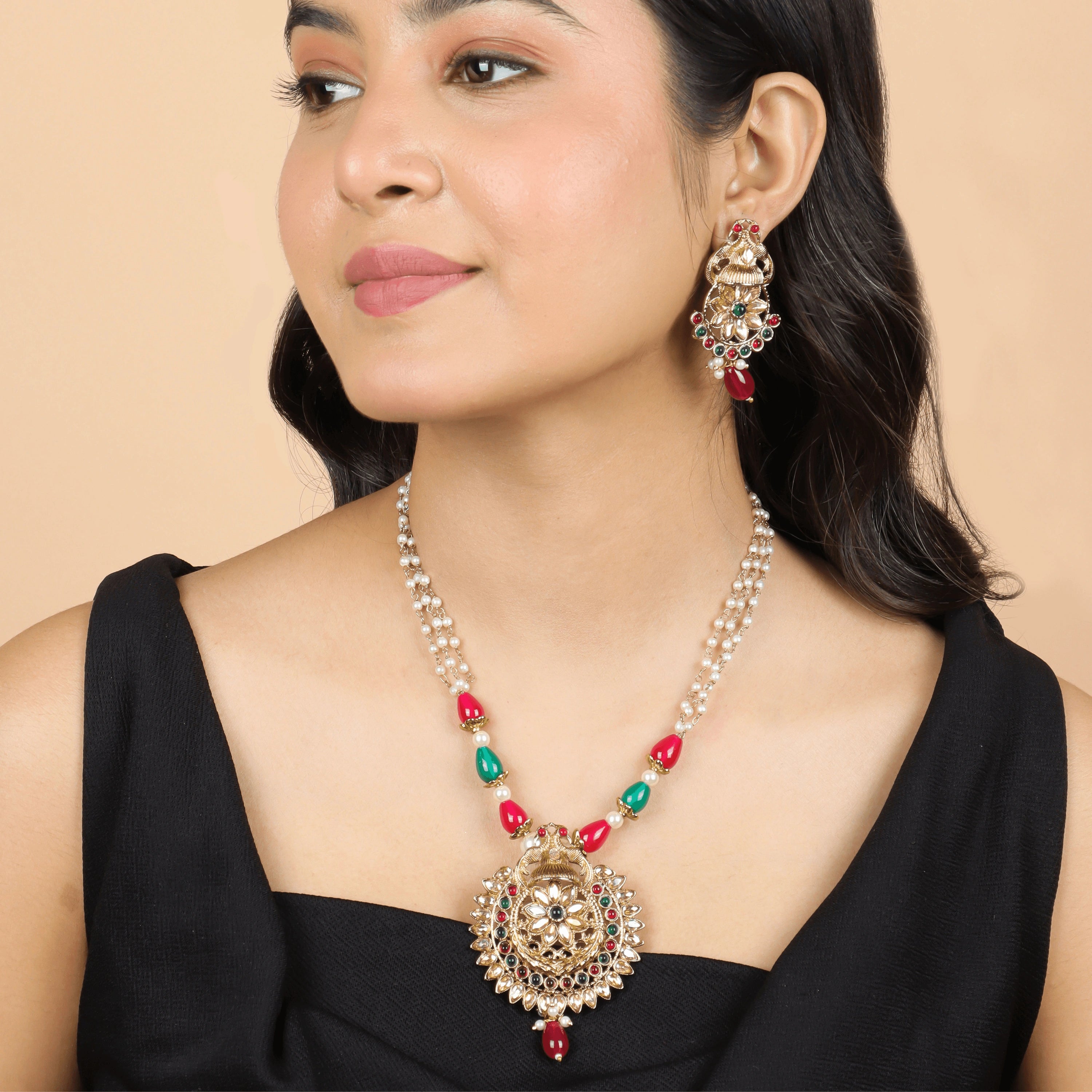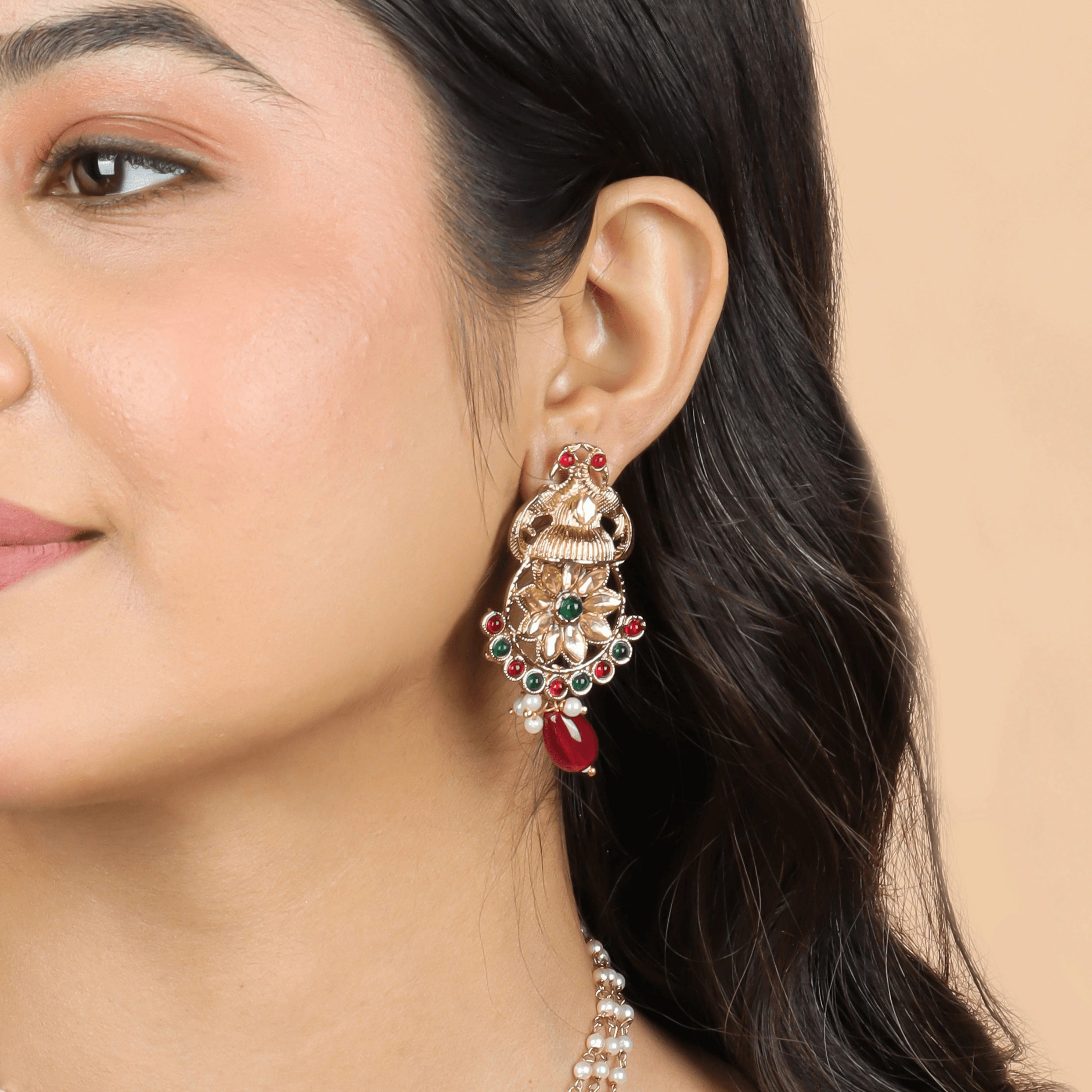 Rajwadi Red & Green Kundan Necklace with Earrings