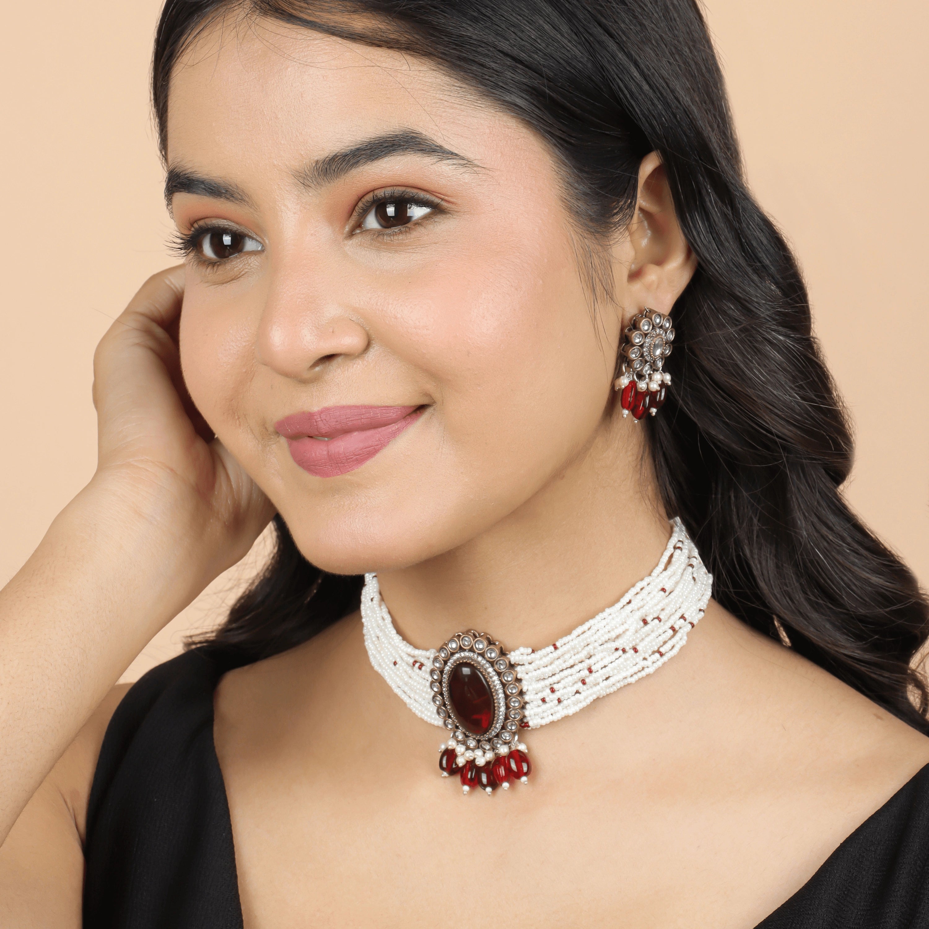 Red Stone Pearl Choker with Earrings - Rukhmani