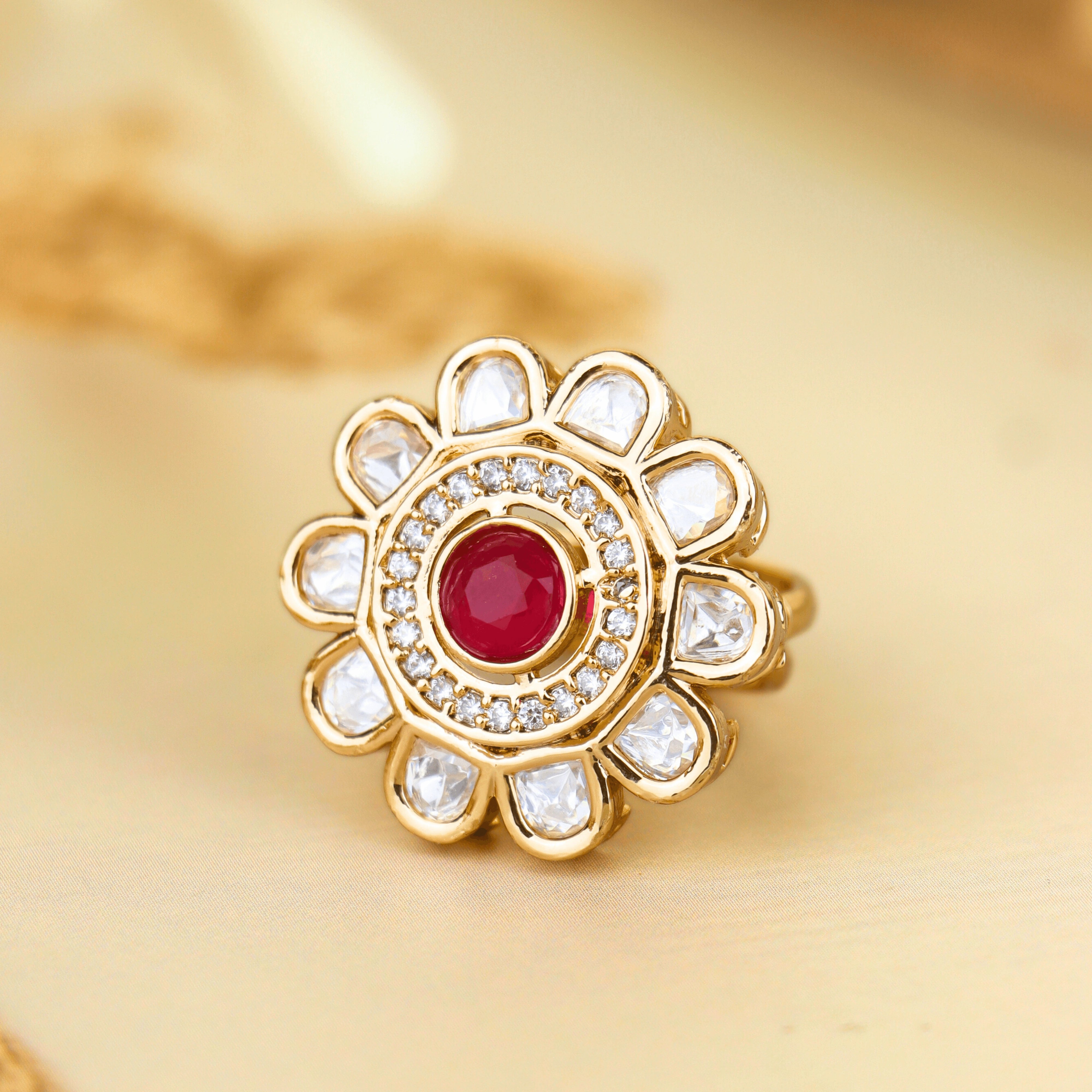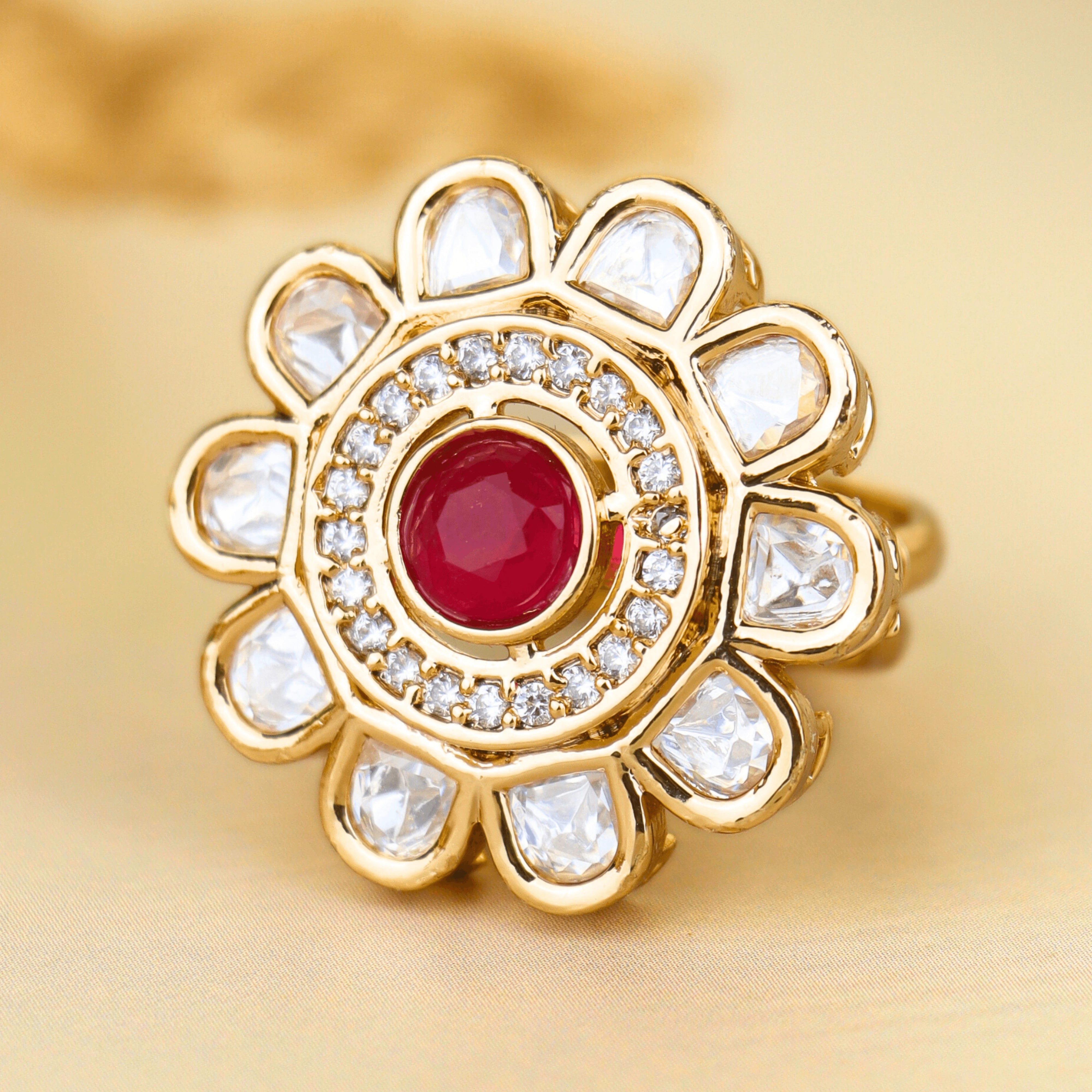 Traditional Design Red Kundan and White Diamonds Gold Plated Rings - Rukhmani