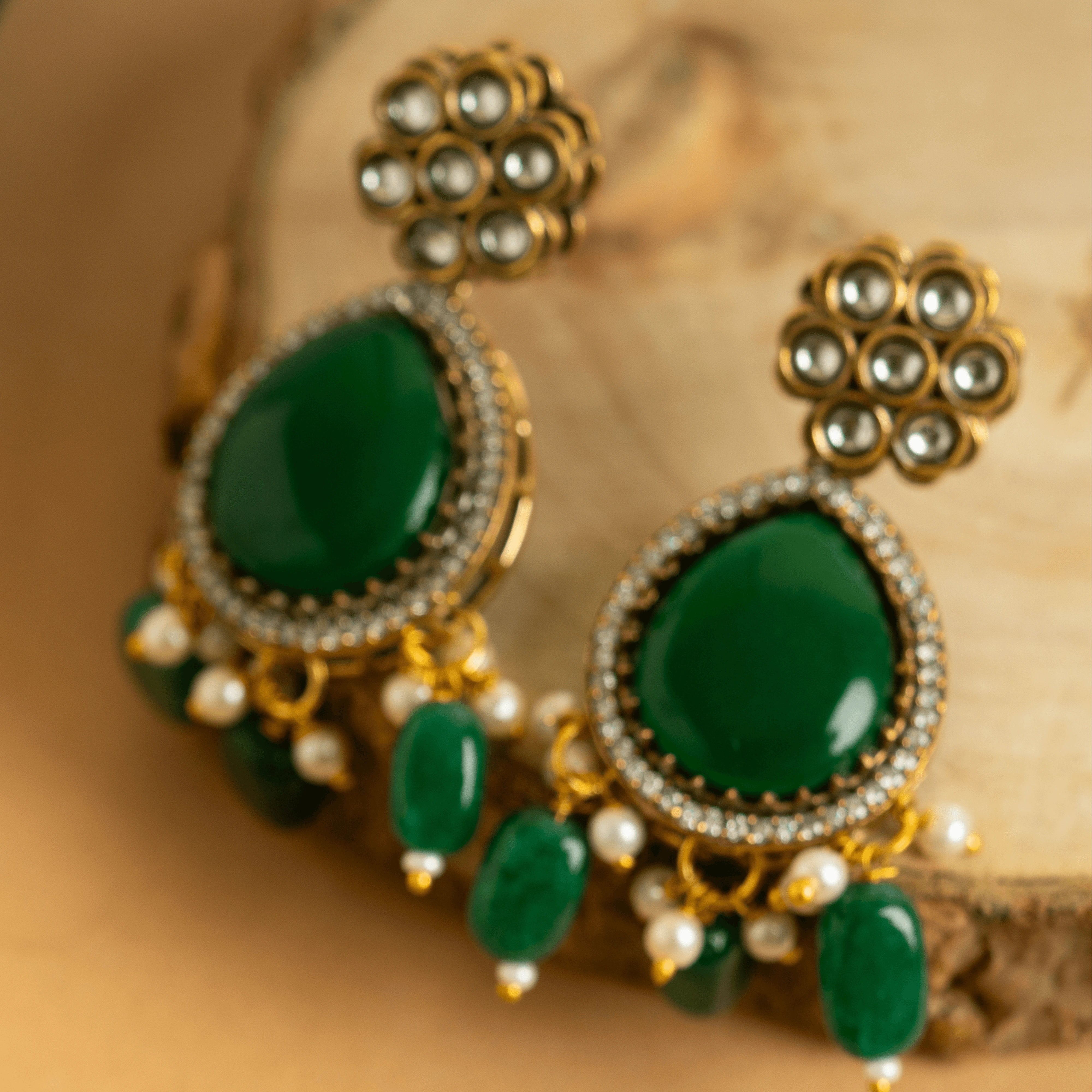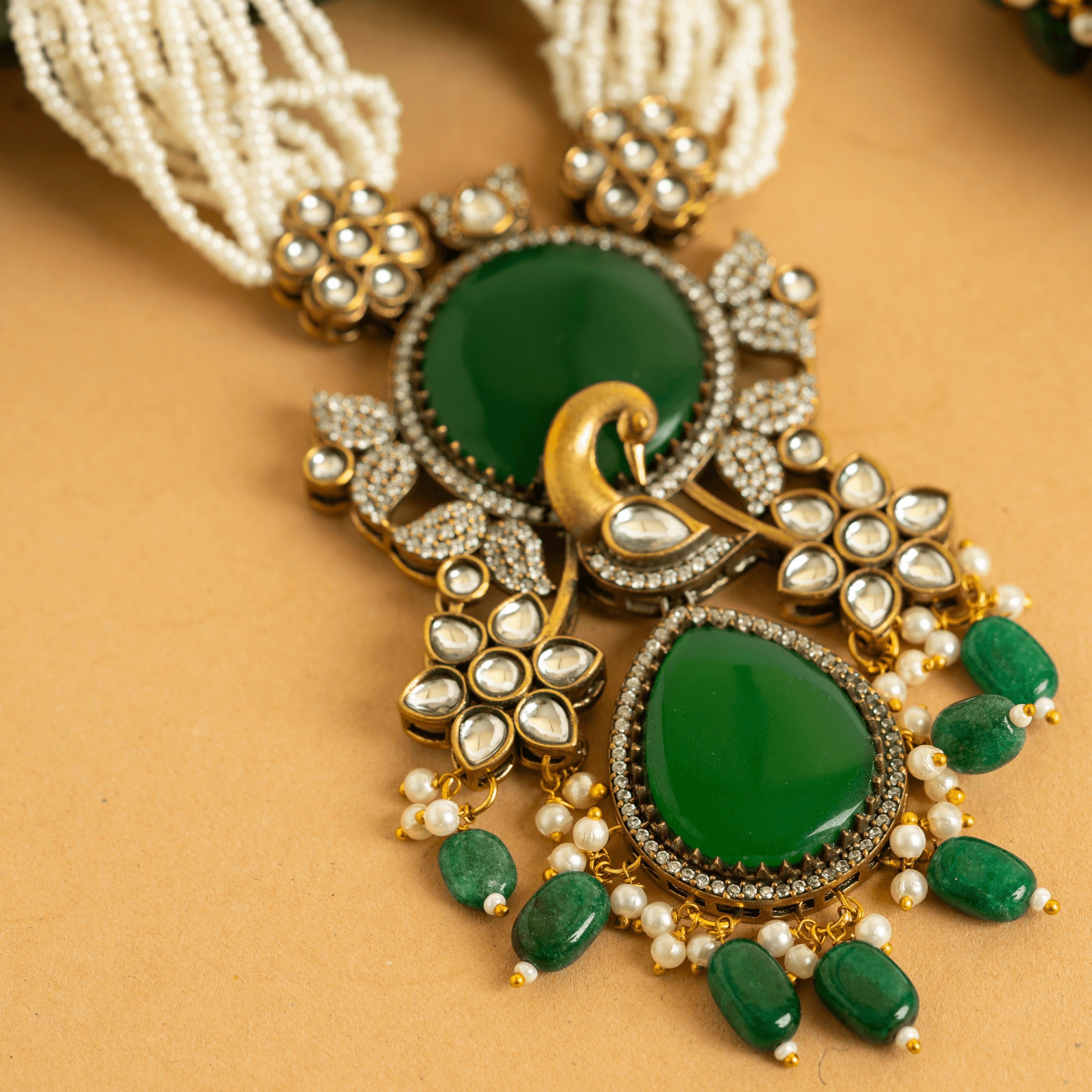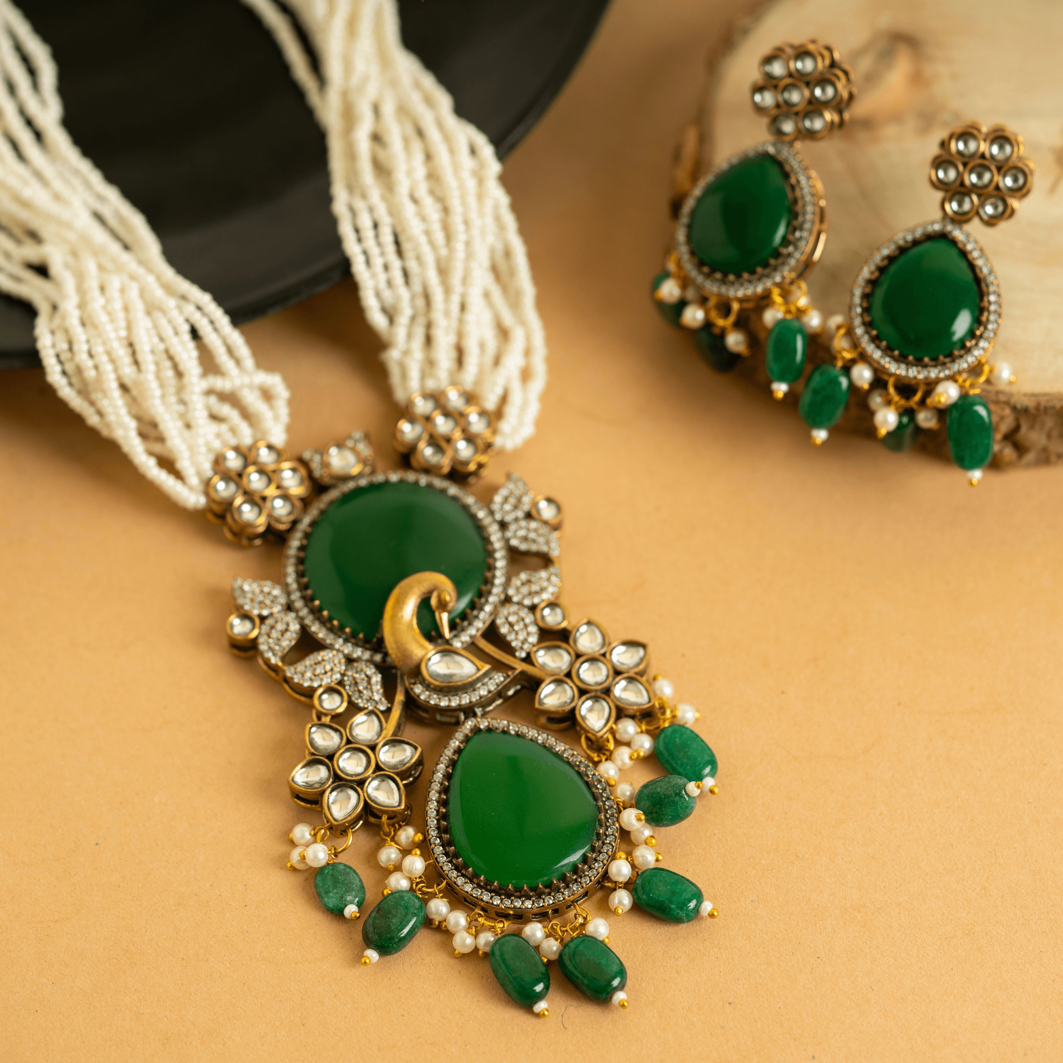 Traditional Gold Plated Green Kundan with Diamond Jaipuri Set with Earrings